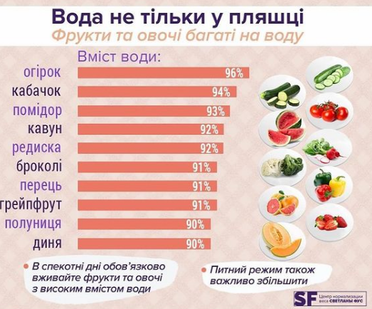 Среди овощей предпочтение стоит отдать огурцам, кабачкам, помидорам, листовому салату и сельдерею — в этих продуктах содержится большое количество воды. Из фруктов, чтобы поддерживать водный баланс, выбирайте арбузы и дыни, они утоляют жажду лучше, чем любые "диетические" напитки с сахаром. Эти фрукты, содержащие 90-95% воды, помогают поддерживать водный баланс и очищают организм.
