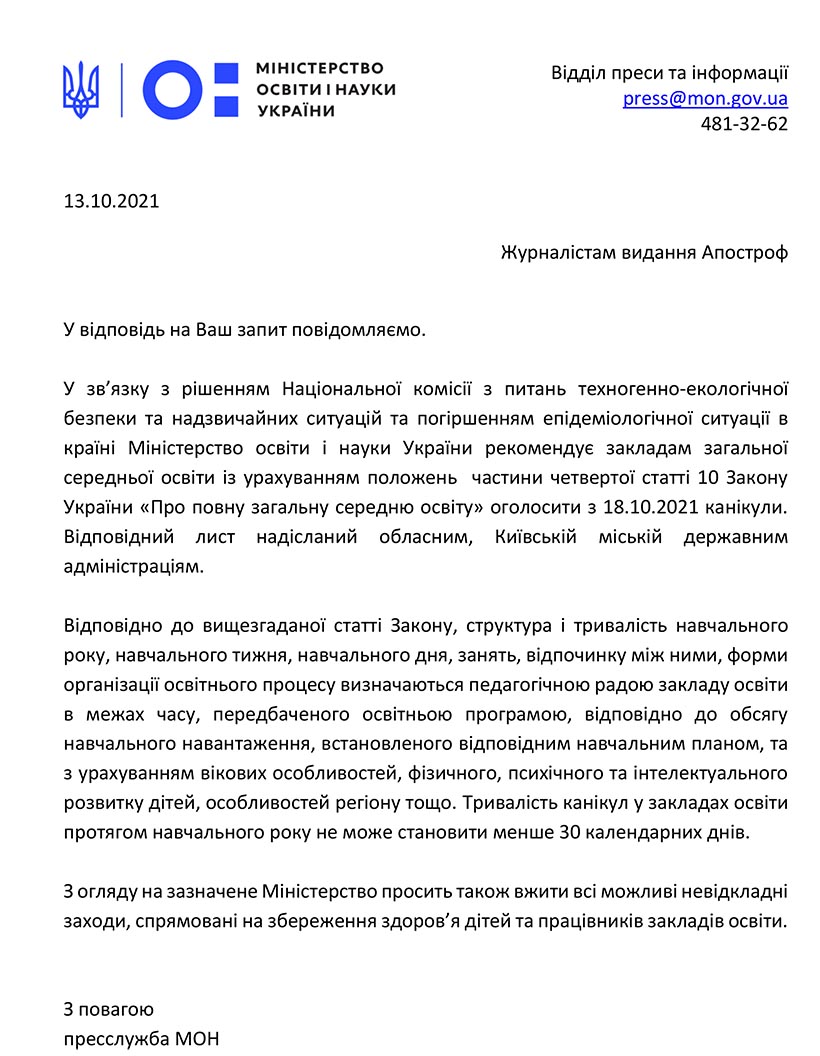 Министерство образования и науки Украины рекомендует сместить осенние школьные каникулы и начать их не 25, а 18 октября. Как отметил глава Минздрава Виктор Ляшко, это позволит снизить заболеваемость по меньшей мере на 15%.
