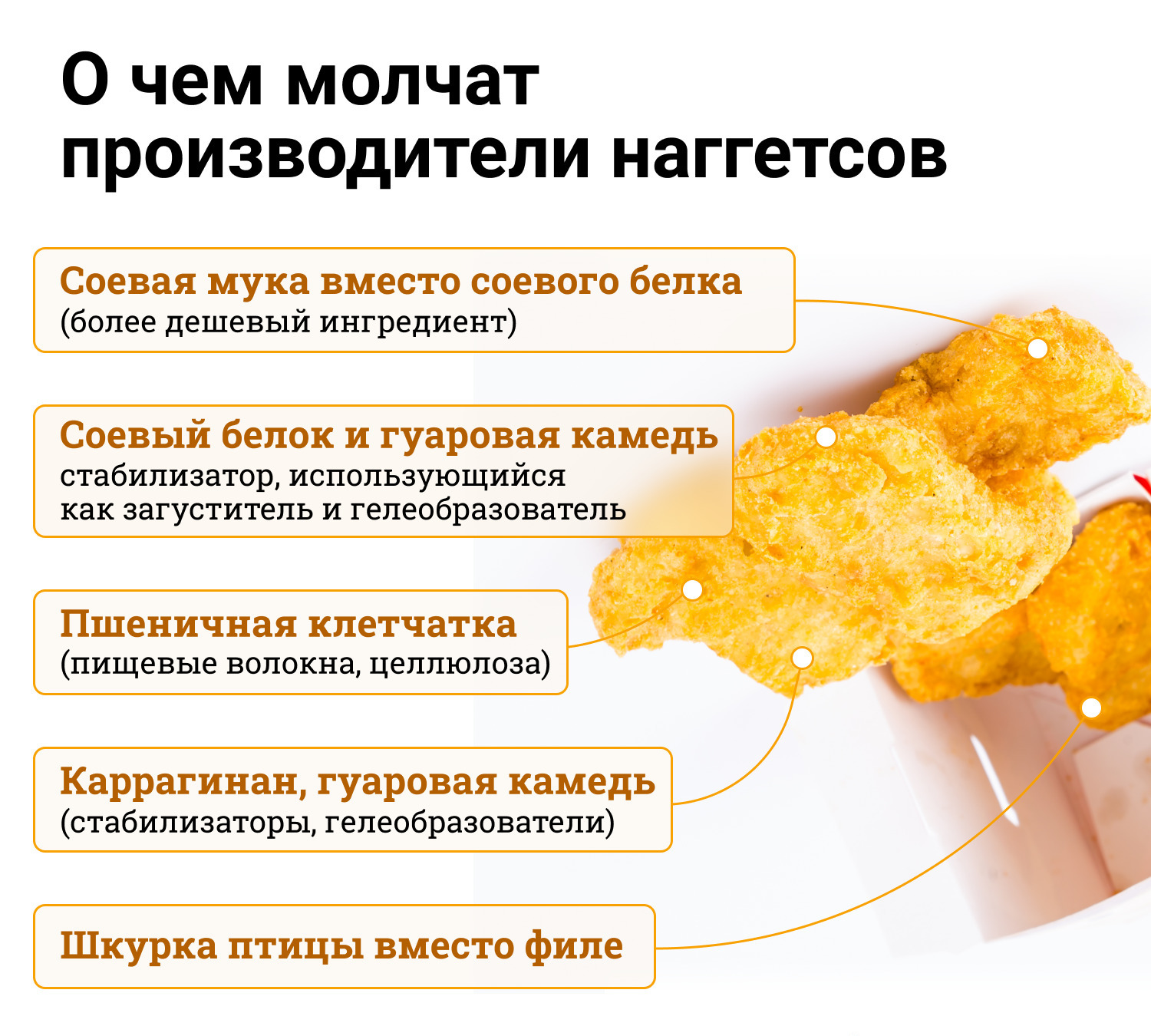Еще один вредный момент – дополнительный сахар в составе. В добавок, многие макают наггетсы в кетчуп и другие соусы, что делает блюдо еще более вредными.