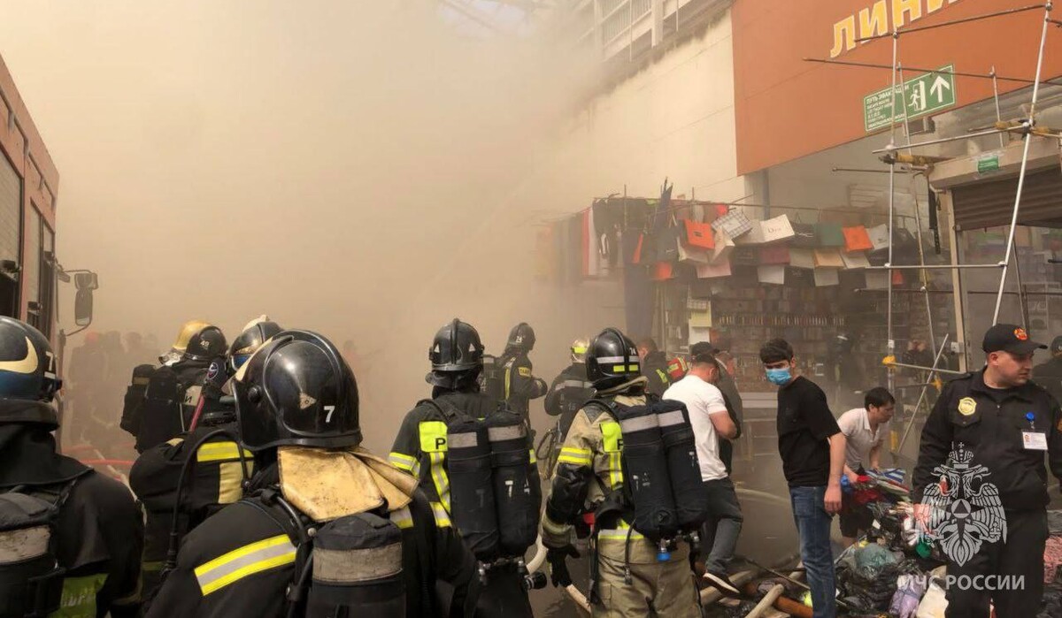 В городе москва (россия) во вторник, 13 июня, загорелся один из крупных продовольственных павильонов на рынке "Садовник". Огонь быстро распространяется по другим помещениям, поэтому оттуда в оперативном порядке эвакуируют покупателей и работников. Последние бросаются прямо в пламя, чтобы спасти хотя бы какую-то часть своего товара.