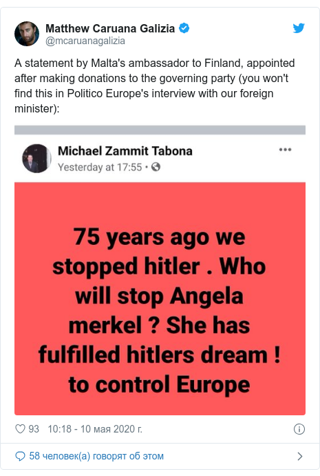 Позже посол удалил пост. Однако скриншоты с заявлением можно увидеть в твитах журналистов. В частности, о нем пишет Мэтью Каруана Галиция - сын убитой мальтийской журналистки-расследователя Дафны Каруаны Галиции.