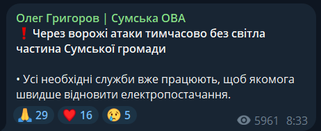По сообщению главы Сумской ОВА Олега Григорова, часть Сумской общины временно осталась без света в результате российских обстрелов.