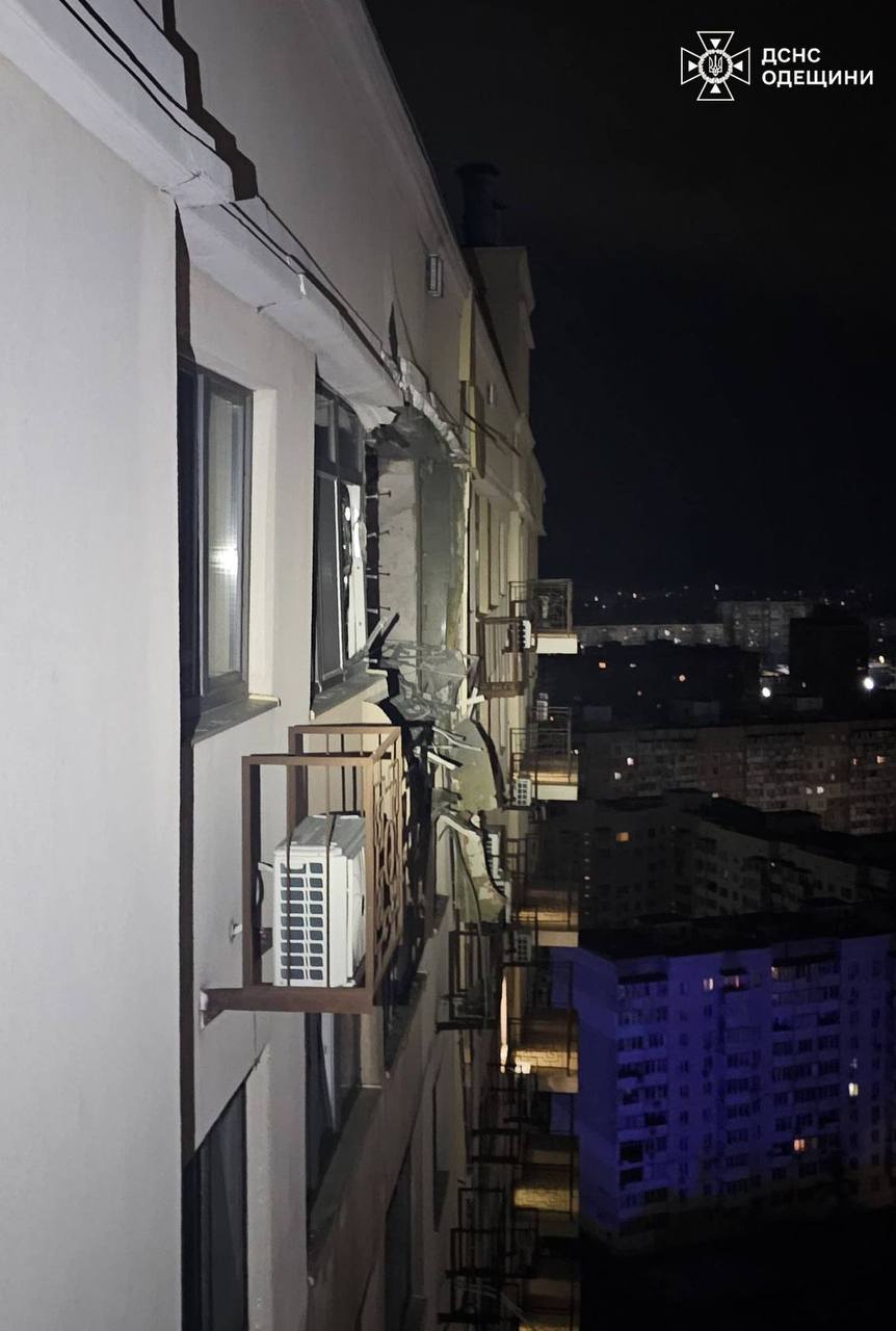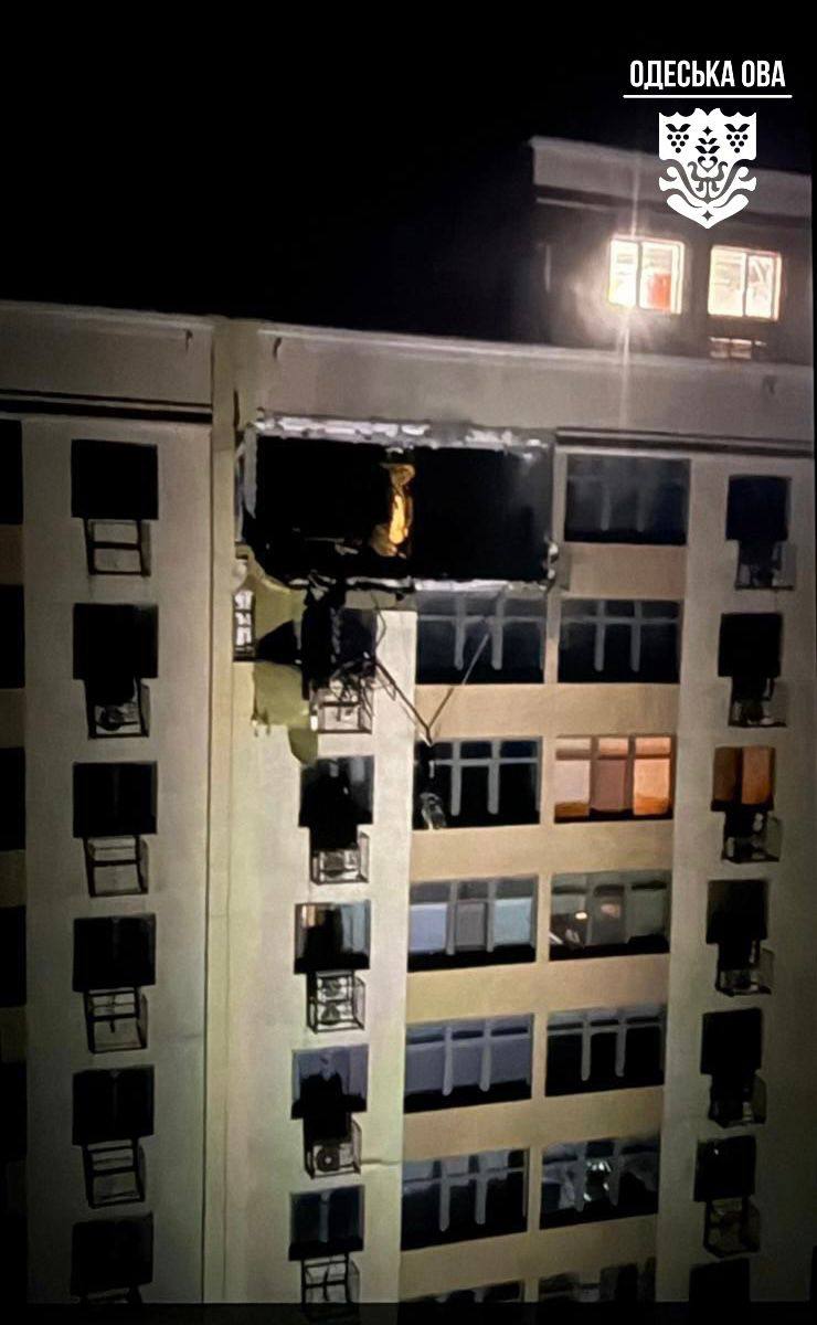 В Одесском районе беспилотник попал в 25-этажный жилой дом. Там повреждены две квартиры, фасад здания, также выбиты окна в соседних домах и изуродовано несколько припаркованных рядом авто. Также повреждены четыре частных домовладения.