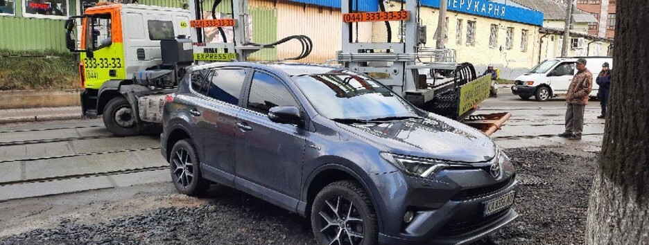 В Киеве "герой парковки" заблокировал движение трамваев: его сдвинул эвакуатор (видео)