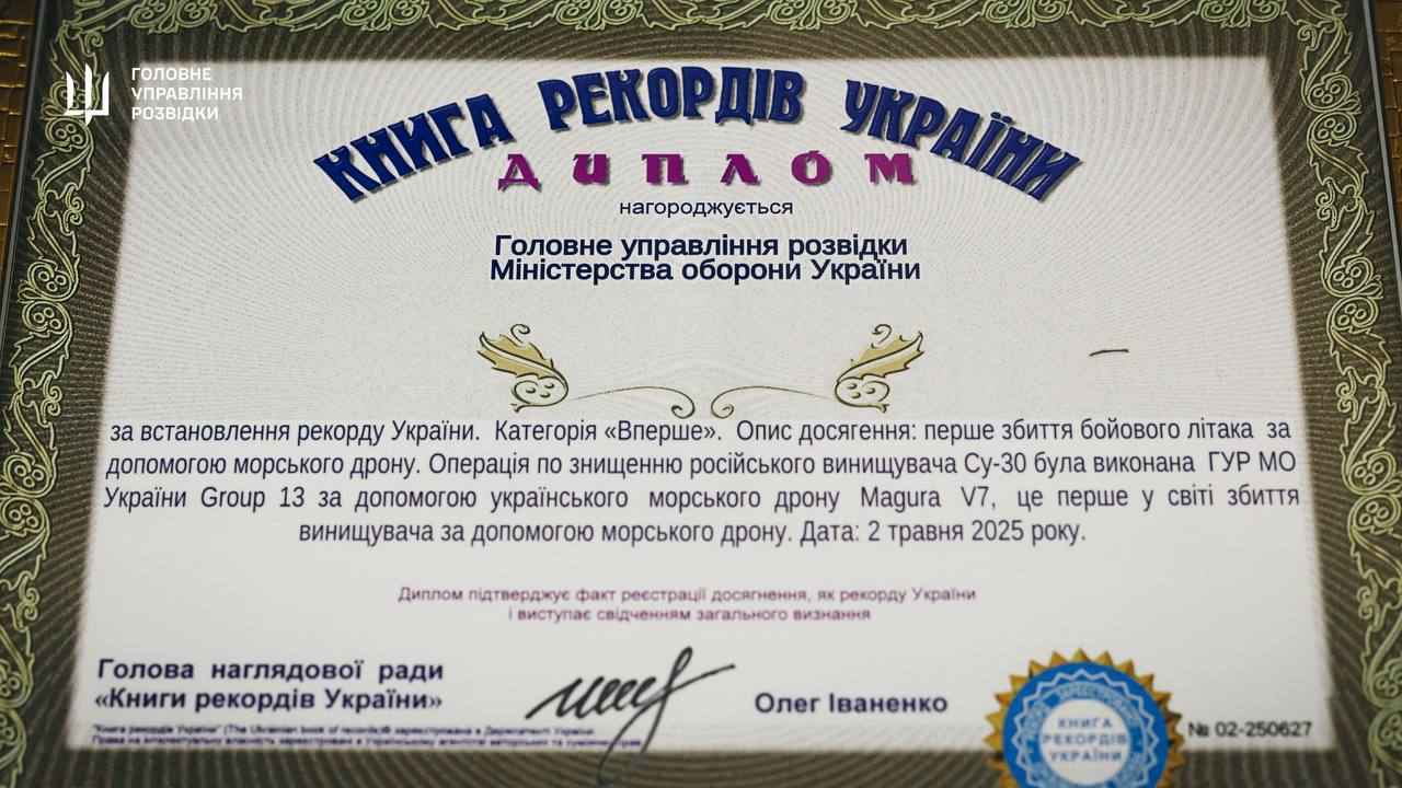 В Книге рекордов Украины официально зафиксировали пять боевых рекордов, которых смогла достичь украинская разведка благодаря использованию морских дронов MAGURA. Вручение официальных сертификатов прошло в Музее военной разведки Украины. Здесь недавно открылась экспозиция, посвященная морским дронам MAGURA.
