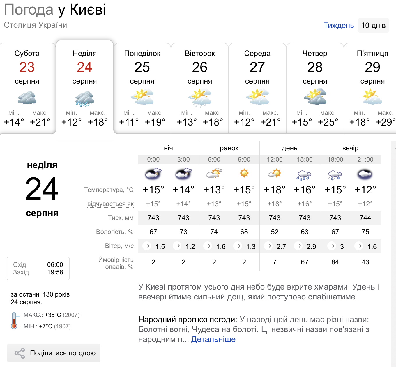 (Прогноз погоды в Киеве на День Независимости 2025. Данные: sinoptik.ua)