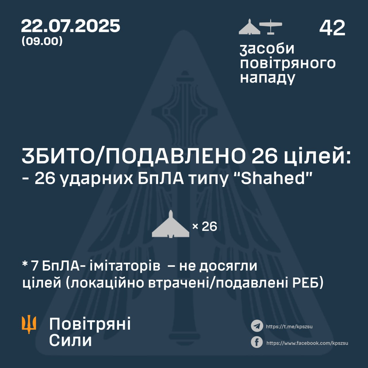 В ночь на 22 июля враг применил для удара по Украине 42 ударных БпЛА типа "Шахед" и беспилотников-имитаторов разных типов. По состоянию на 09:00 противовоздушная оборона уничтожила 26 дронов на юге и востоке страны.