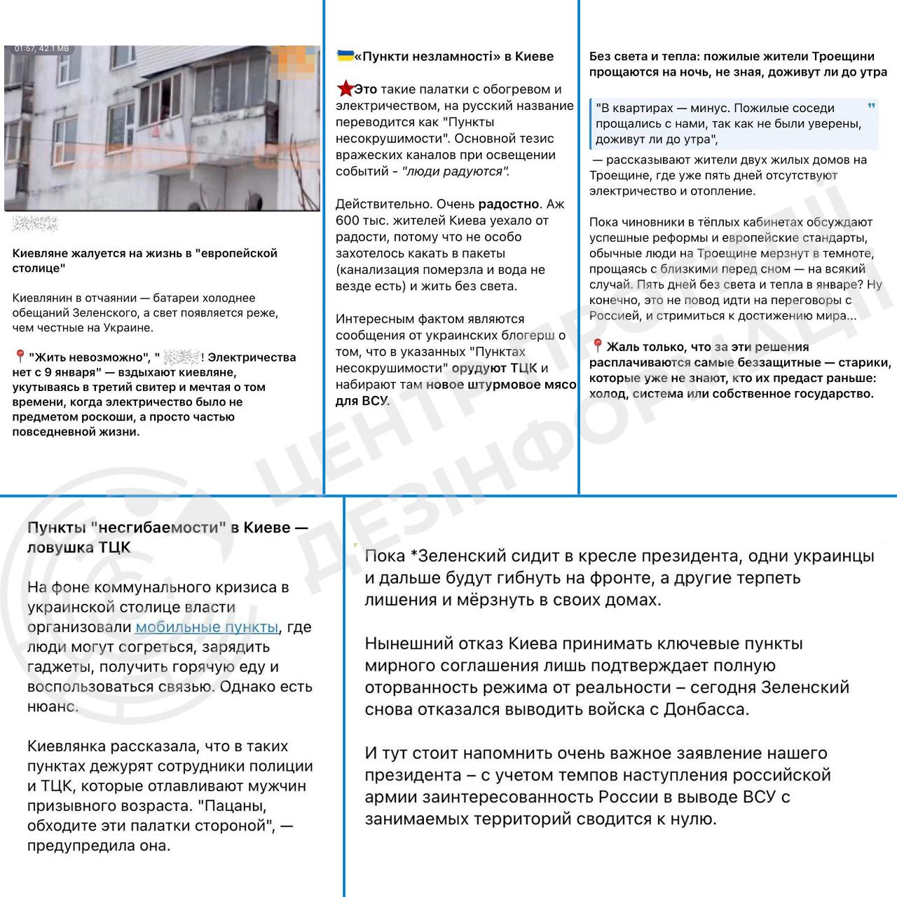 "Центральный нарратив кампании — перекладывание ответственности на украинскую власть за последствия российских ударов. Параллельно навязывается мысль, что якобы уступки со стороны Украины на переговорах могут решить проблему с электроснабжением. Таким образом враг пытается трансформировать гуманитарный шантаж в политическое давление на власти Украины", — отметили в Центре.