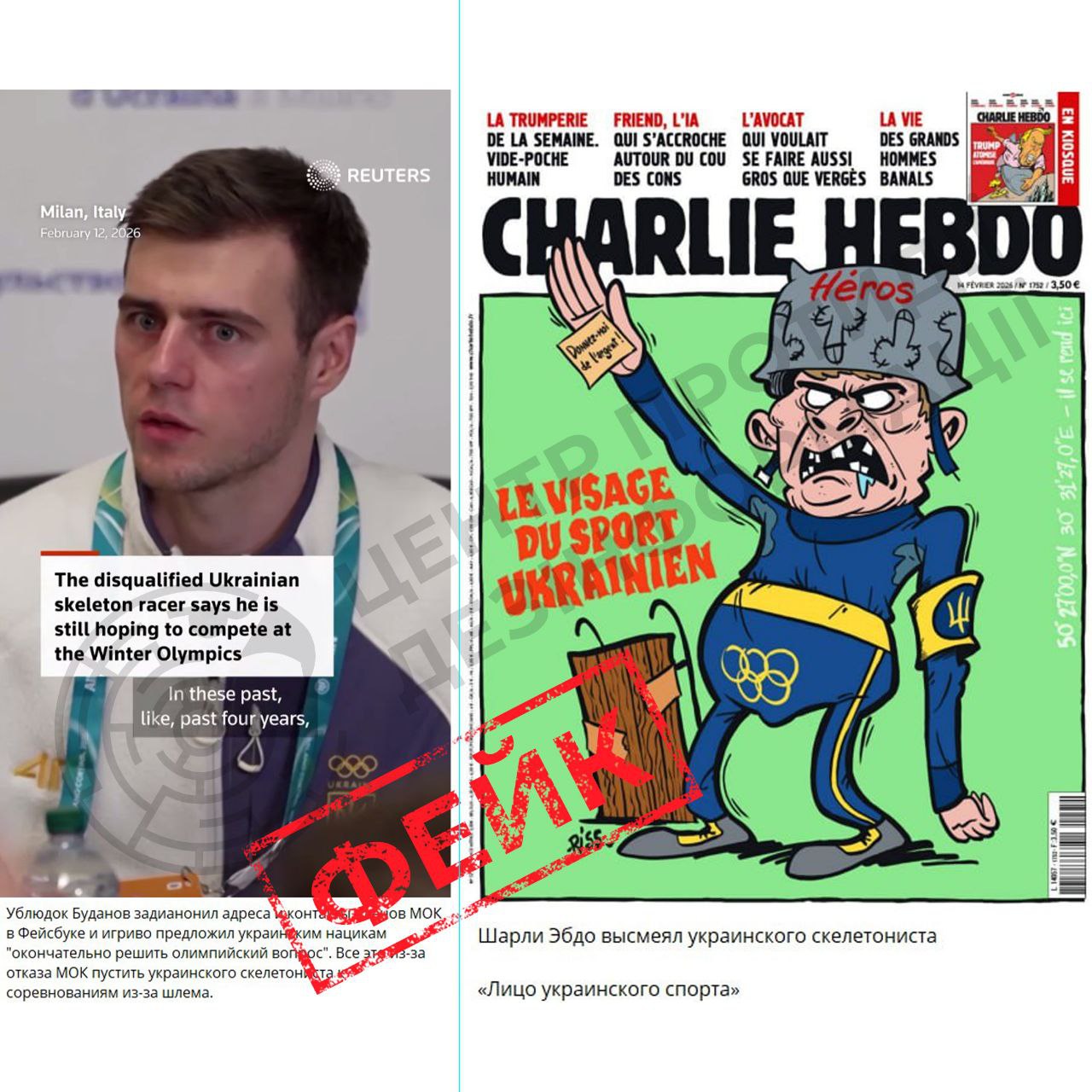 Кроме этого, фиксируется распространение фейковой обложки французского сатирического журнала Charlie Hebdo, на которой якобы украинские спортсмены изображены нацистами. На самом деле, такой обложки на официальных ресурсах издания не существует.