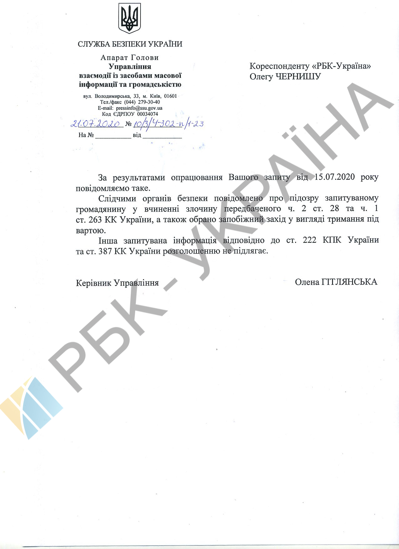 "Следователями органов безопасности сообщено о подозрении запрашиваемому гражданину (Байдале, - ред.) в совершении преступления, предусмотренного ч.2 ст. 28 и ч.1 ст. 263 Уголовного кодекса Украины (незаконное обращение с оружием и боеприпасами, совершенное группой лиц, - ред.), а также избрана мера пресечения в виде содержания под стражей", - говорится в ответе ведомства.