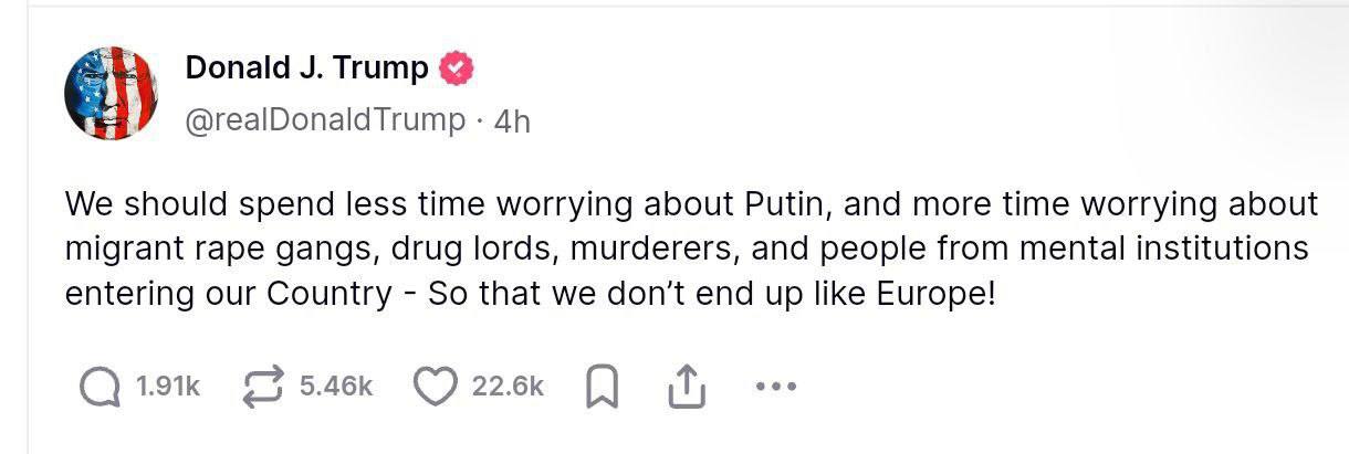 "Мы должны меньше беспокоиться о Путине и больше беспокоиться о бандах мигрантов-насильников, наркобаронов, убийц и людей из въезжающих в нашу страну психиатрических больниц – чтобы мы не стали такими, как Европа!", — написал Трамп.
