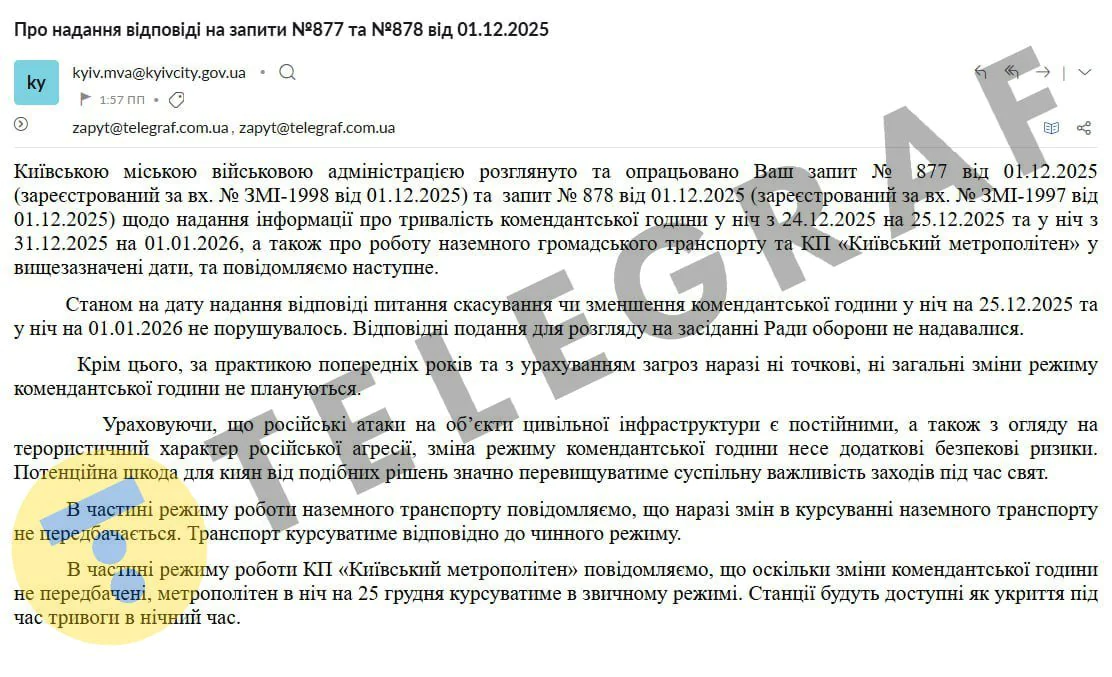 В военной администрации Киева подчеркивают, что изменение режима комендантского часа создает дополнительные риски безопасности населения, особенно учитывая террористические атаки России, в том числе объекты гражданской инфраструктуры.