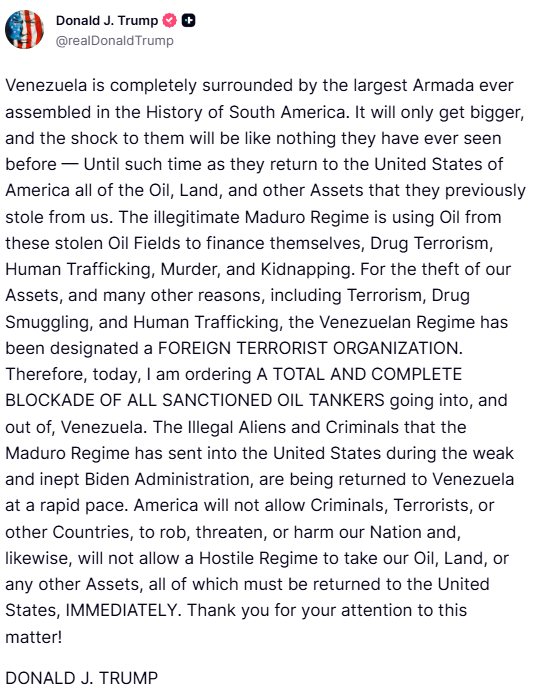 Президент США Дональд Трамп заявил о введении полной блокады всех подсанкционных нефтяных танкеров, входящих в Венесуэлу или выходящих из нее. Также режим Николаса Мадуро признан иностранной террористической организацией.