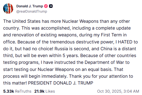 Президент США Дональд Трамп поручил Министерству войны возобновить испытания американского ядерного оружия. По его словам, это решение принято в ответ на программы испытаний других стран.
