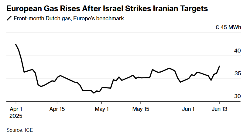 Цены на природный газ 13 июня в Европе выросли на 6,6% после того, как Израиль совершил серию ударов по Ирану. Газовые фьючерсы достигли своего наивысшего уровня за пять недель. Также наблюдается рост цен на нефть.