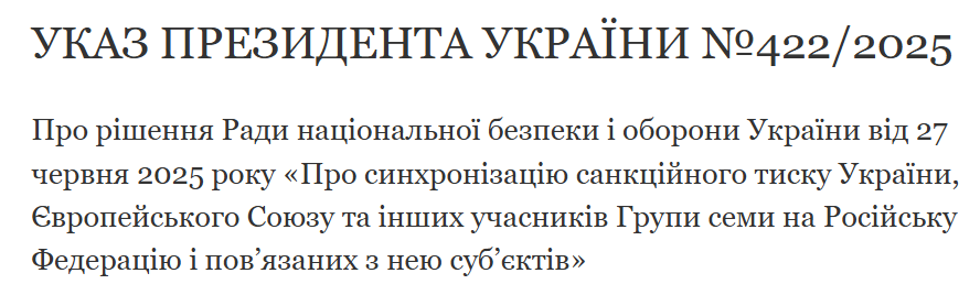 "Ввести в действие решение Совета национальной безопасности и обороны Украины от 27 июня 2025 г. "О синхронизации санкционного давления Украины, Европейского Союза и других участников "Группы семи" на российскую федерацию и связанных с ней субъектов".
