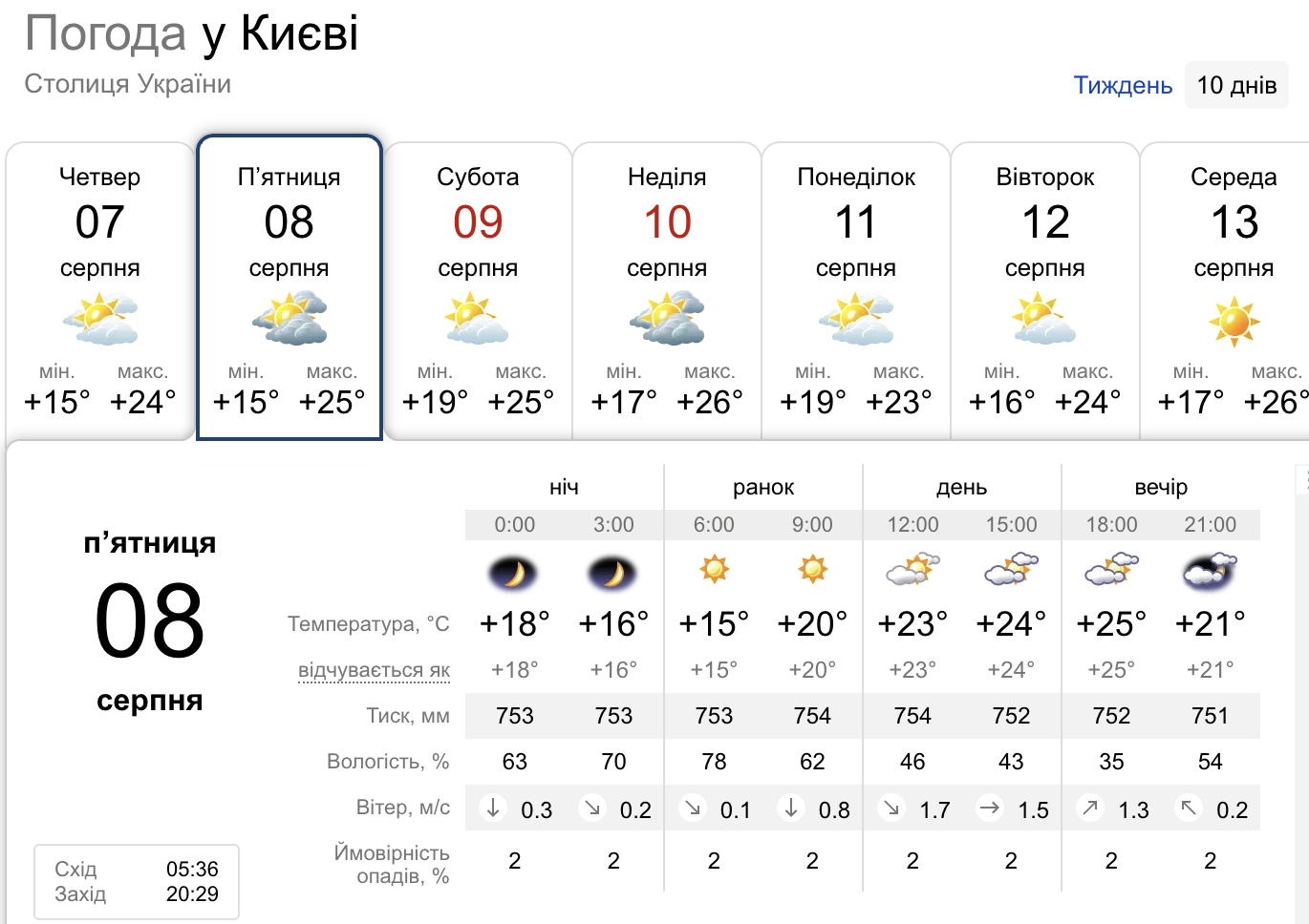 (Прогноз погоды в Киеве на 8 августа 2025 года. Данные: sinoptik.ua)