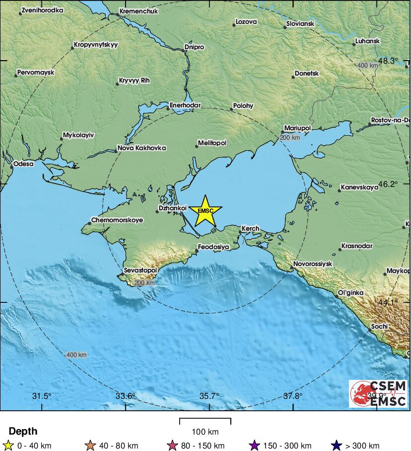 Первые толчки были зарегистрированы около 11:47 по киевскому времени. Эпицентом землетрясения стало Азовское море, примерно в 78 километрах северо-западнее Керчи и в 30–35 км от Щелкино (ТОТ Крыма).