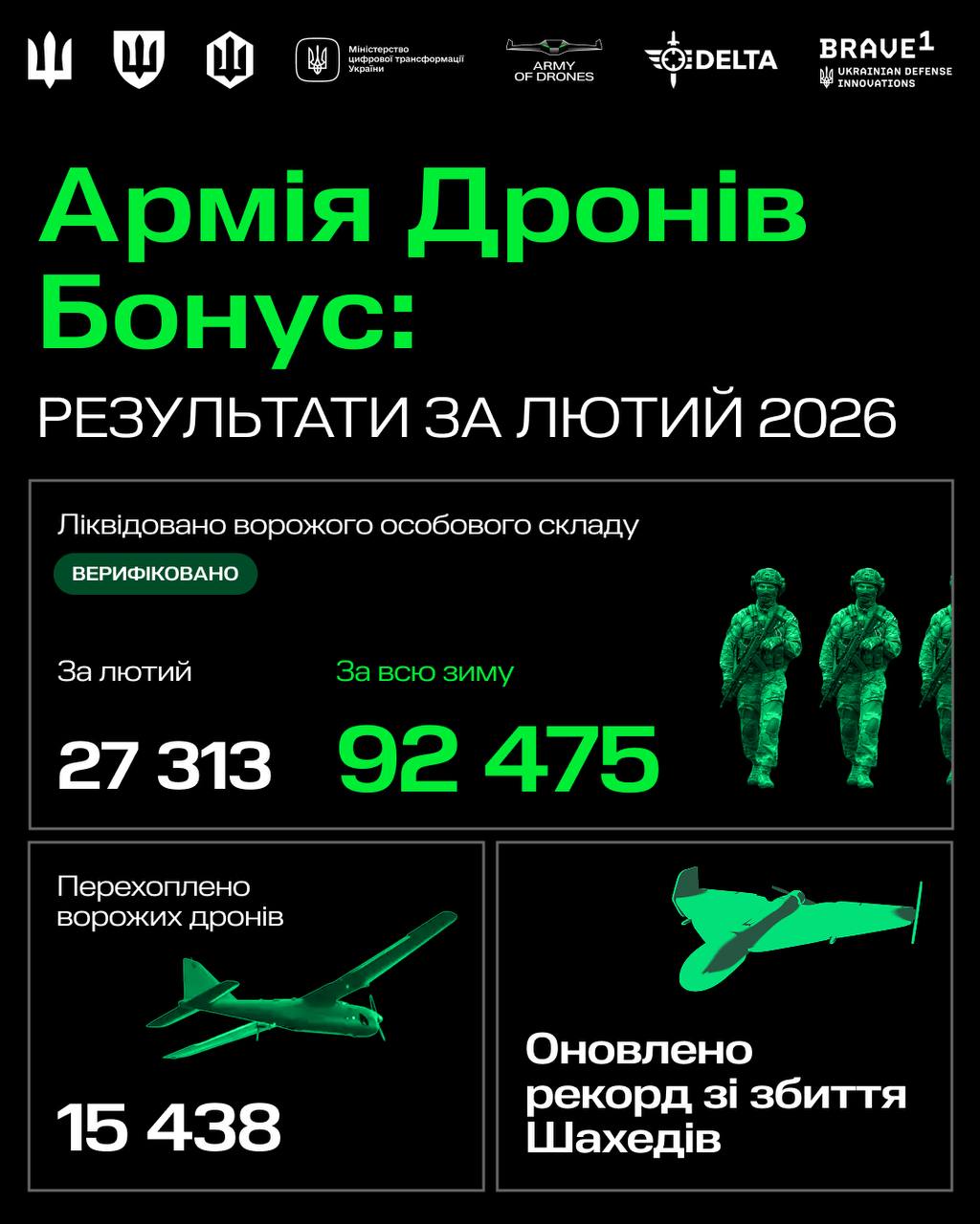 За три месяца зимы Силы обороны ликвидировали 92475 российских военных. Большинство потерь - 88 898, - враг понес вследствие ударов беспилотников в рамках программы "Армия дронов.Бонус".