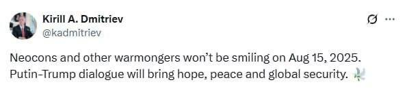"Неоконсерваторы и другие разжигатели войн не будут улыбаться 15 августа 2025 года. Диалог Путина и Трампа принесет надежду, мир и глобальную безопасность", - написал он в соцсети X.