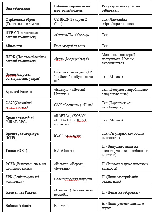 Анализ обеспечения ВСУ основными классами вооружения за счет собственного ВПК