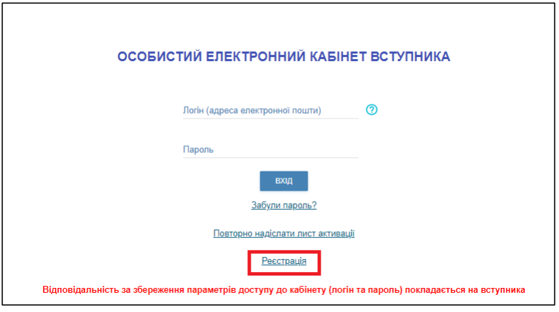 Для початку слід вказати адресу електронної пошти, яка далі буде логіном для входу. Система автоматично перевірить логін на збіг з іншими. На електронну адресу надійде лист для активації доступу до електронного кабінету.