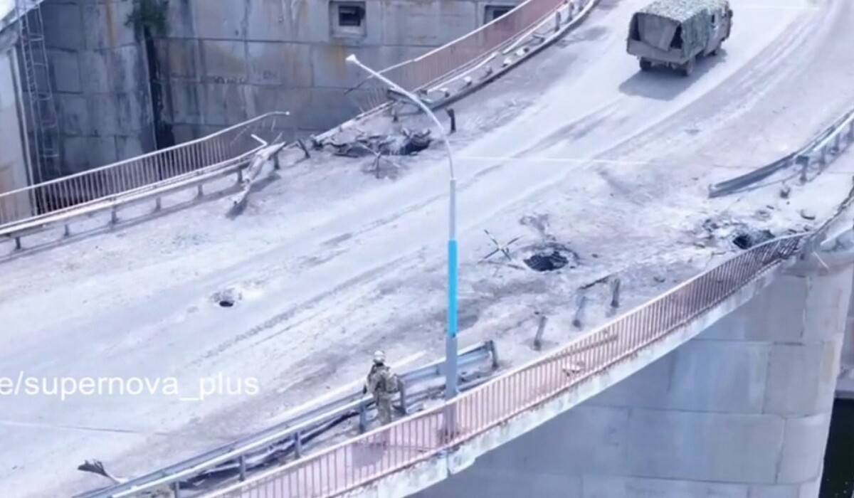 На кадрах видно, що ЗСУ пробили одну зі смуг моста наскрізь – у дорожньому покритті зяє наскрізна дірка, видно вигнуту арматуру та інші деталі мосту. З обох боків розірвано залізну огорожу.
