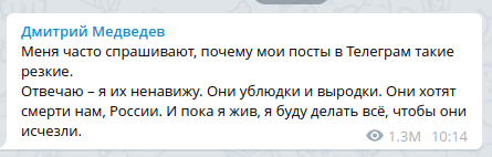 Дмитро Медведєв, який неодноразово заявляв про те, що сам веде свої сторінки в соцмережах, написав про свою ненависть у Telegram.