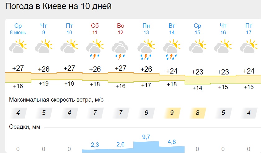 У столиці України сьогодні та найближчі два дні буде похмура погода із мінливою хмарністю. Максимальна температура вдень з 8 по 10 червня очікується від +26 до +27 градусів, вночі стовпчики термометра опустяться до +16+19 градусів.