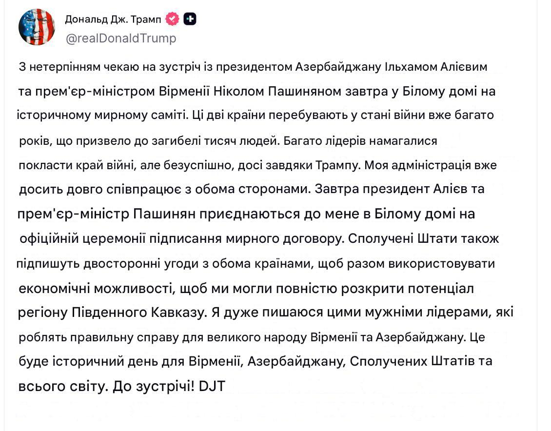 "Я з нетерпінням чекаю на візит президента Азербайджану Ільгама Алієва та премʼєр-міністра Вірменії Нікола Пашиняна до Білого дому завтра на Історичний саміт миру", — зазначив очільник Білого дому.