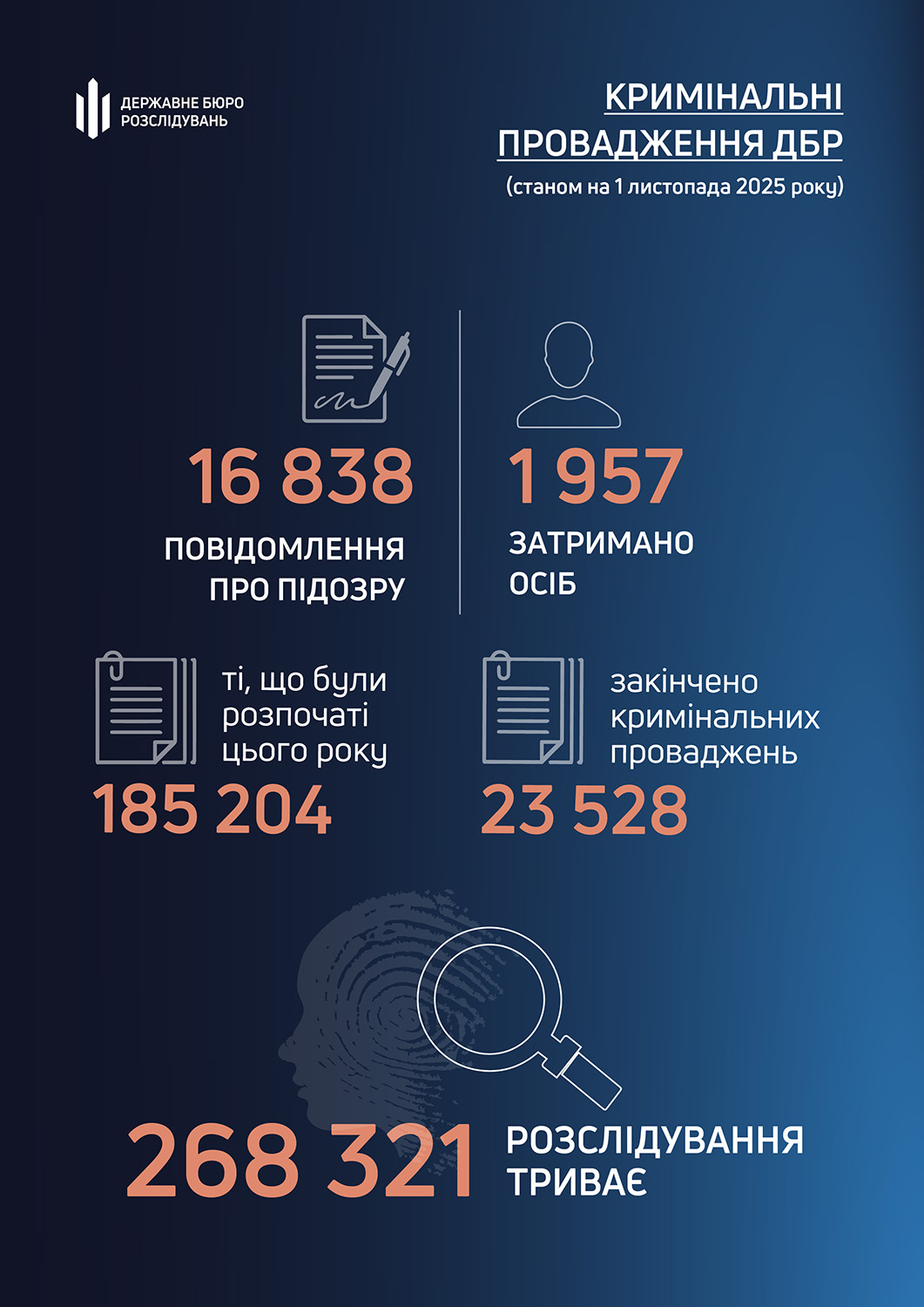 Від початку 2025 року Державне бюро розслідувань завершило понад 6,5 тисячі досудових розслідувань і направило до суду справи щодо майже 7000 осіб. Серед обвинувачених — народні депутати, колишні урядовці, судді, посадовці категорії "А" та інші.