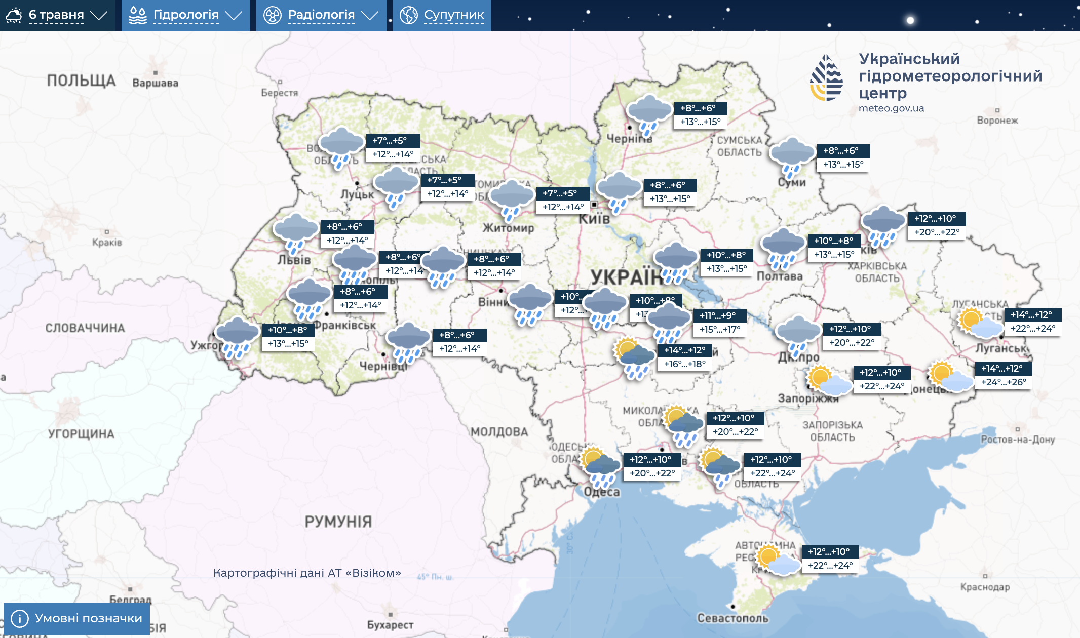 В Україні у вівторок, 6 травня, погода залишатиметься нестабільною - країну охоплять дощі, а температура повітря коливатиметься залежно від регіону. Атмосферні фронти принесуть хмарність і опади в більшість областей, тож день обіцяє бути похмурим і вологим для значної частини країни. Подробиці у матеріалі Realist