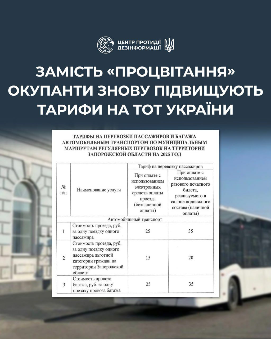 У тимчасово окупованих містах Запорізької області окупаційна влада нову підвищила тарифи на проїзд у громадському транспорті. Аналогічна ситуація з тарифами на основні послуги спостерігається і на Донеччині.
