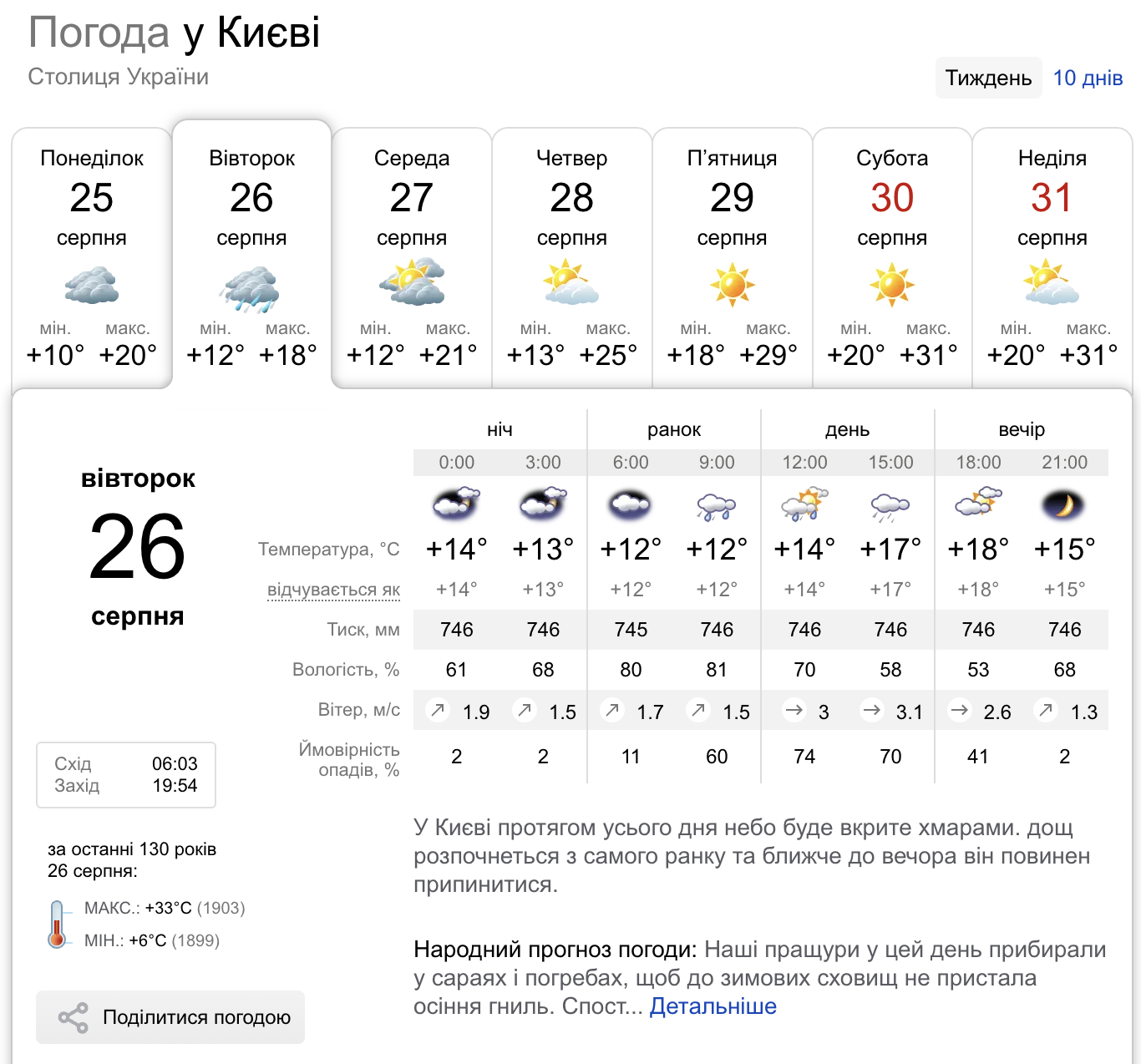 (Прогноз погоди у Києві на 26 серпня. Дані: sinoptik.ua)
