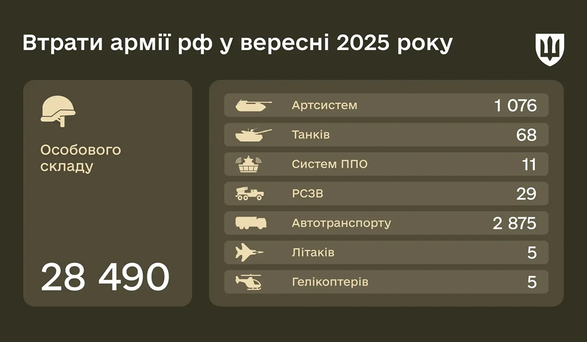 Протягом вересня російська окупаційна армія втратила 28 490 військових, що умовно дорівнює чисельності майже трьох мотострілецьких дивізій. Про це повідомила пресслужба Міністерства оборони України.