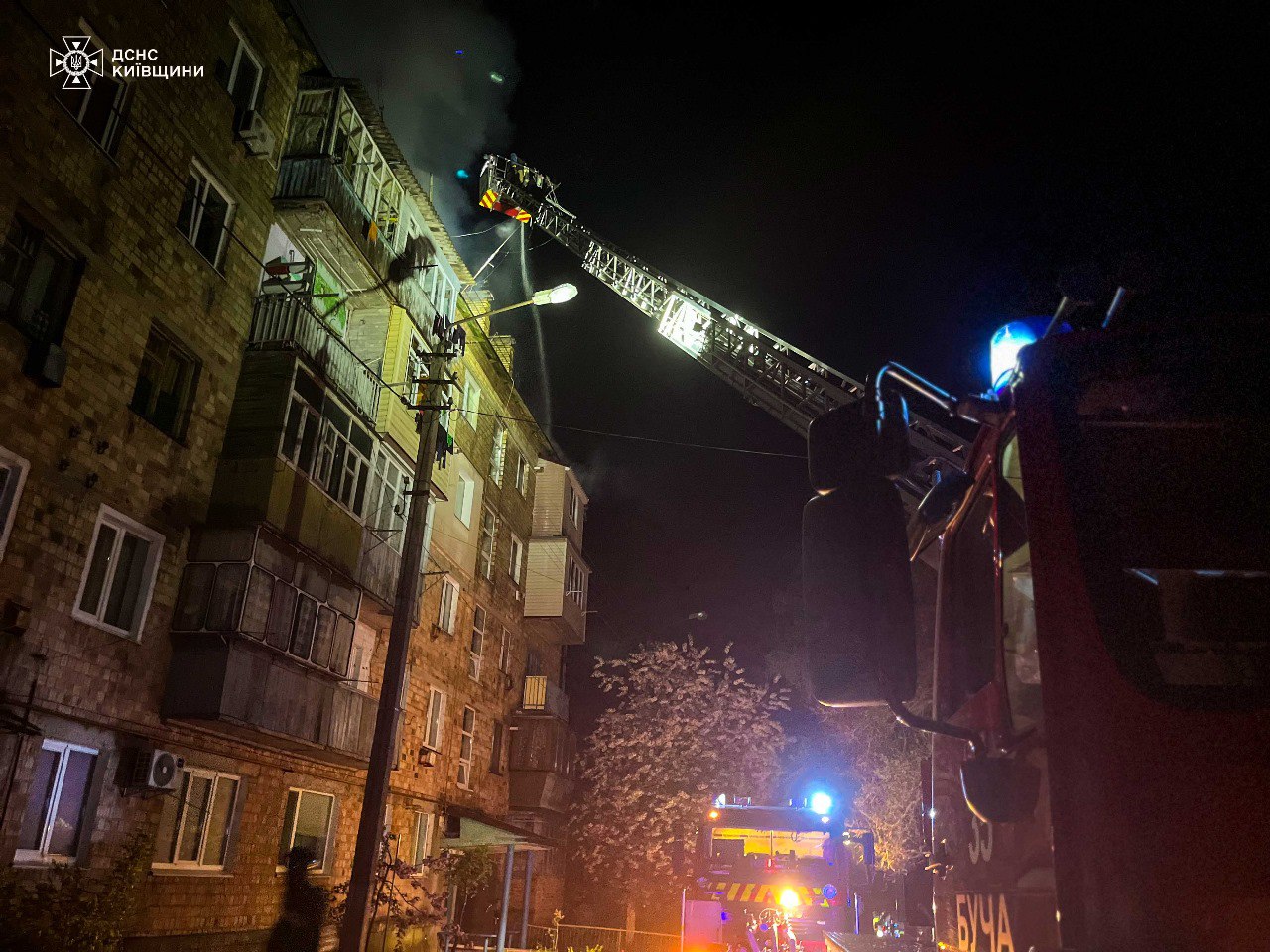 У Бучанському районі пошкоджено п’ятиповерхівку. Вогнеборцям вдалося загасити пожежу в магазині та на даху житлового будинку. Евакуйовано п'ятеро людей.