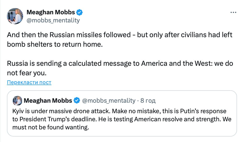 Меган Моббс, донька спецпредставника президента США Дональда Трампа Кіта Келлога, прокоментувала масовану атаку дронів та ракет по Києву, внаслідок якої постраждали понад 80 людей, шестеро осіб загинули. Вона також закликала не лишати дії росії без відповіді.