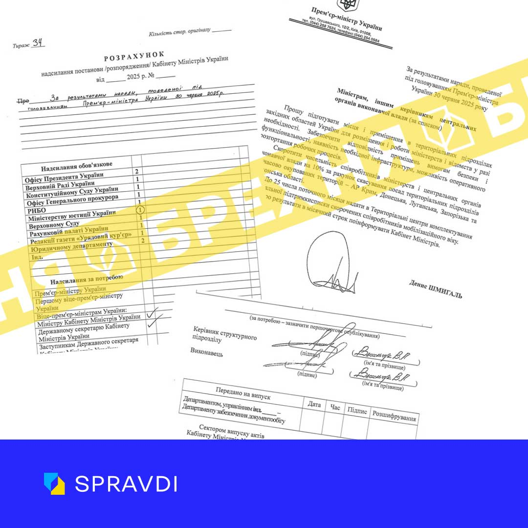 Підробка подається як частина начебто "доручення за результатами наради" з підписом Шмигаля від 30 червня 2025 року. Так, прем'єр нібито доручив міністерствам та центральним органам виконавчої влади готувати приміщення у західних областях для можливої передислокації.