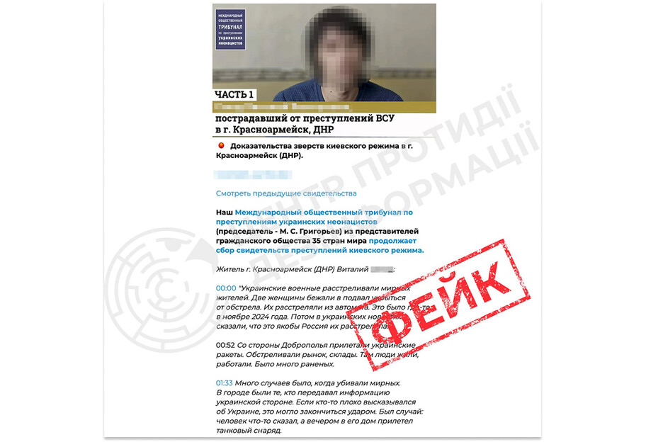 Подібні відео поширюють від імені так званого "міжнародного громадського трибуналу зі злочинів українських неонацистів" із свідченнями нібито жителі Покровська про розстріл цивільних українськими військовими у листопаді 2024 року.