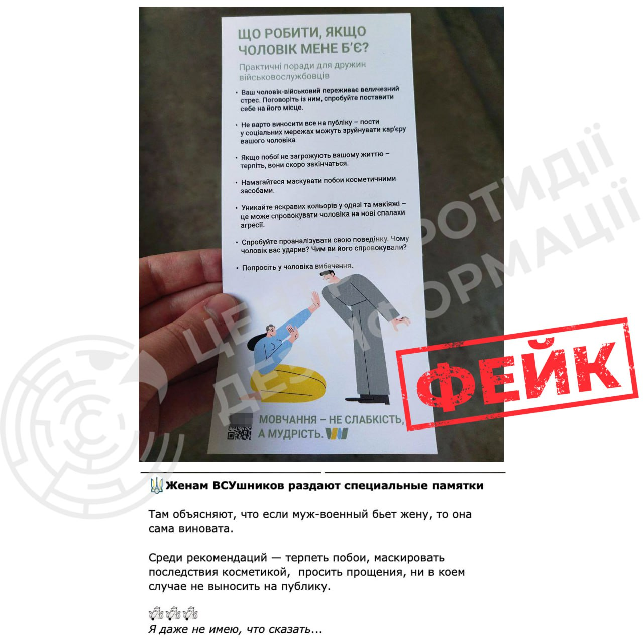 Російські Telegram-канали розповсюджують підроблені листівки з порадами жінкам "терпіти побої" від чоловіків-військових. У Центрі протидії дезінформації спростували ці фейкові повідомлення.