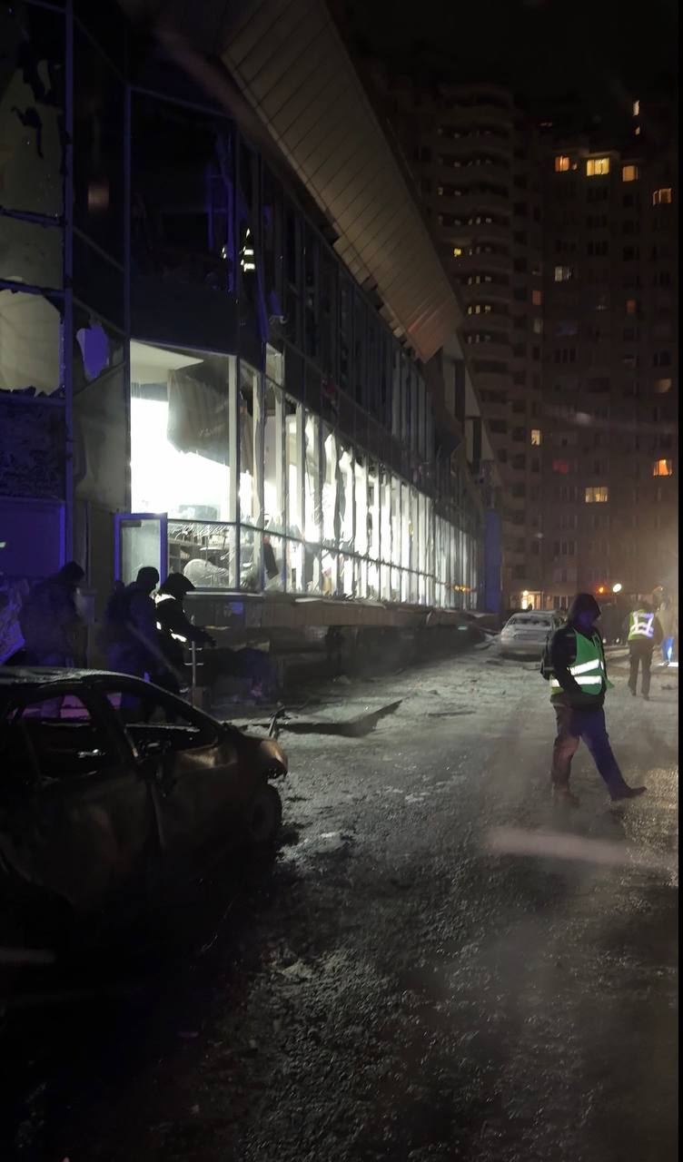 Унаслідок атаки сталася пожежа — загорілися два автомобілі та газова труба. Також пошкоджено дах та технічне обладнання на покрівлі 24-поверхового житлового будинку, шість легкових авто, будівлю фітнес-клубу та вибито скління в навколишніх будинках.