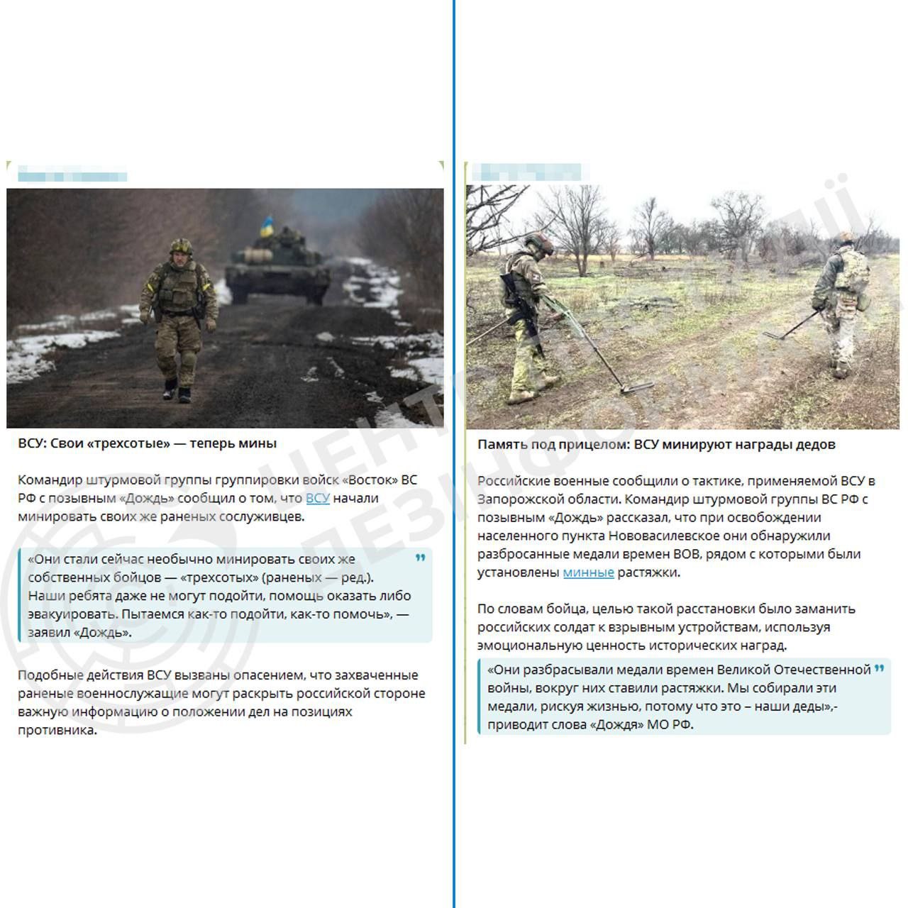 За даними ЦПД, російські пропагандисти поширюють фейки, що нібито українські захисники встановлюють міни на своїх поранених побратимах або навіть старовинних нагородах, щоб "заманити" російських солдатів.