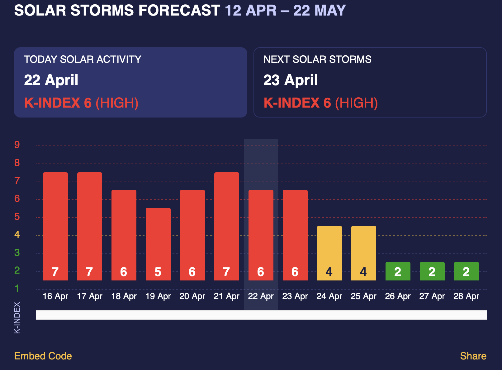 У середу, 23 квітня, Землю накриє сильна магнітна буря, яка, за даними фахівців, матиме К-індекс 6. Це означає, що геомагнітні коливання сягнуть рівня, здатного впливати не лише на здоров’я людей, а й на роботу техніки — зокрема, навігаційних систем, супутникового зв’язку та навіть інтернету. Деталі - у матеріалі Realist.