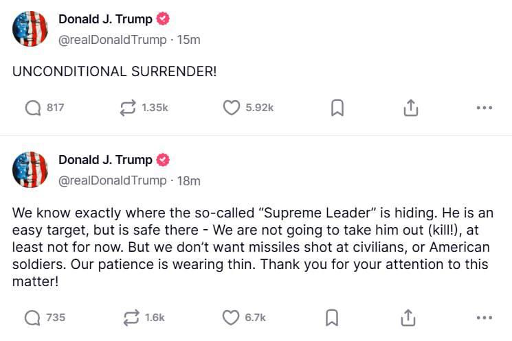 Президент США Дональд Трамп у своєму дописі у своїй соціальній мережі Truth Social назвав Верховного лідера Ірану Алі Хаменеї "легкою мішенню" та вимагає безумовної капітуляції.