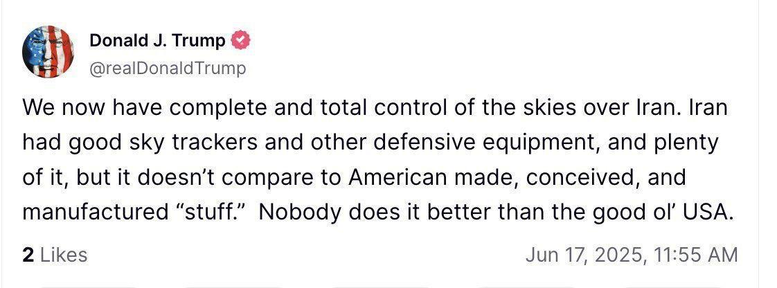Американський лідер також підкреслив, що Сполучені Штати мають повний контроль над повітряним простором Ірану і, хоча іранська ППО вважається ефективною, вона не зможе зрівнятися з американськими технологіями.