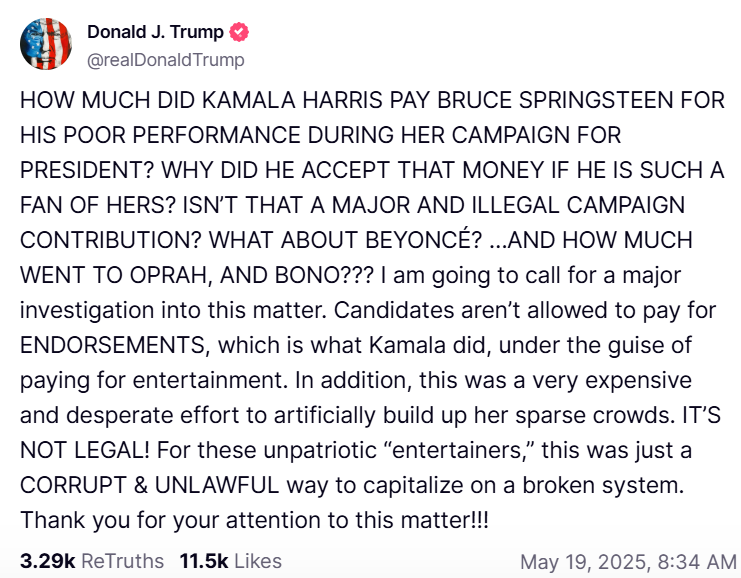 "Скільки Камала Гарріс заплатила Брюсу Спрінгстіну за його поганий виступ під час її кампанії на посаду президента? Чому він прийняв ці гроші, якщо він такий її фанат? Хіба це не великий і нелегальний внесок у передвиборчу кампанію?", — зауважив він.