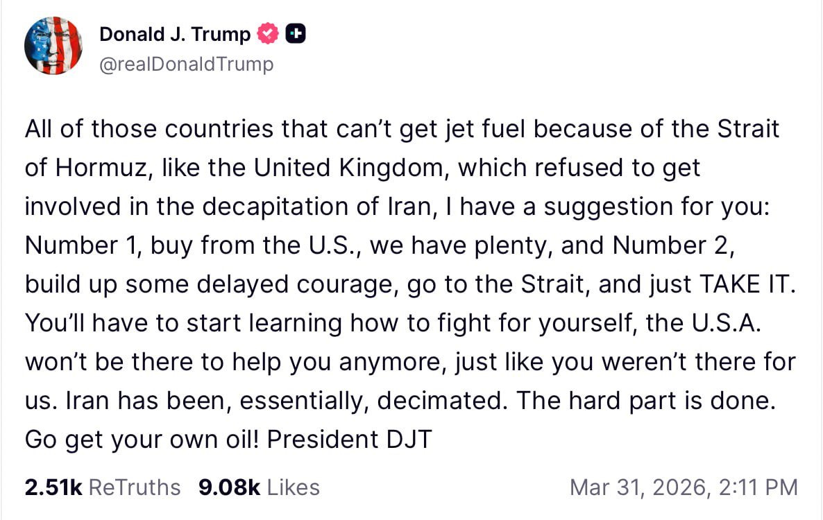 "Усі ті країни, які не можуть отримати авіаційне пальне через Ормузьку протоку, як, наприклад, Сполучене Королівство, яке відмовилося втручатися у обезголовлення Ірану, маю для вас пропозицію: по-перше, купуйте у США, у нас його вдосталь, а по-друге, наберіться відкладеної мужності, вирушайте до протоки і просто ВІДБЕРІТЬ його", — заявив Трамп.