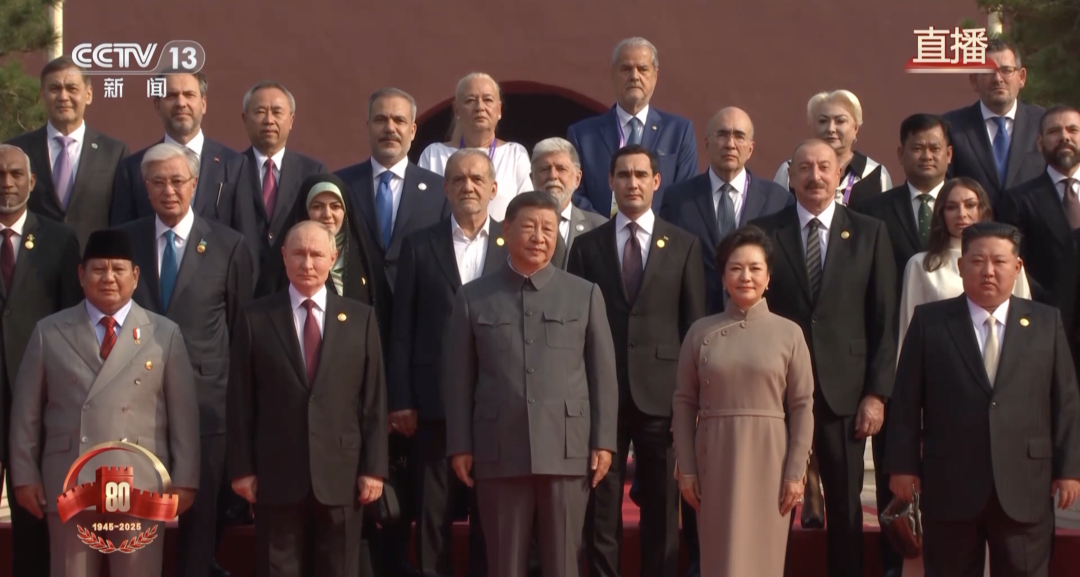 Перед початком параду президент Китаю Сі Цзіньпін зустрів на червоній доріжці Путіна та Кім Чен Ина, після чого вони разом вийшли на трибуну, тоді за ними прослідували інші світові лідери. Загалом на параді були присутні 26 глав держав, серед яких президент Ірану Масуд Пезешкіан, президент Сербії Александер Вучич і прем’єр-міністр Словаччини Роберт Фіцо.