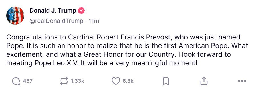 "Це така честь усвідомлювати, що він є першим американським Папою. Яке хвилювання і яка велика честь для нашої країни. Я з нетерпінням чекаю зустрічі з Папою Левом XIV. Це буде дуже значущий момент", — написав Трамп.