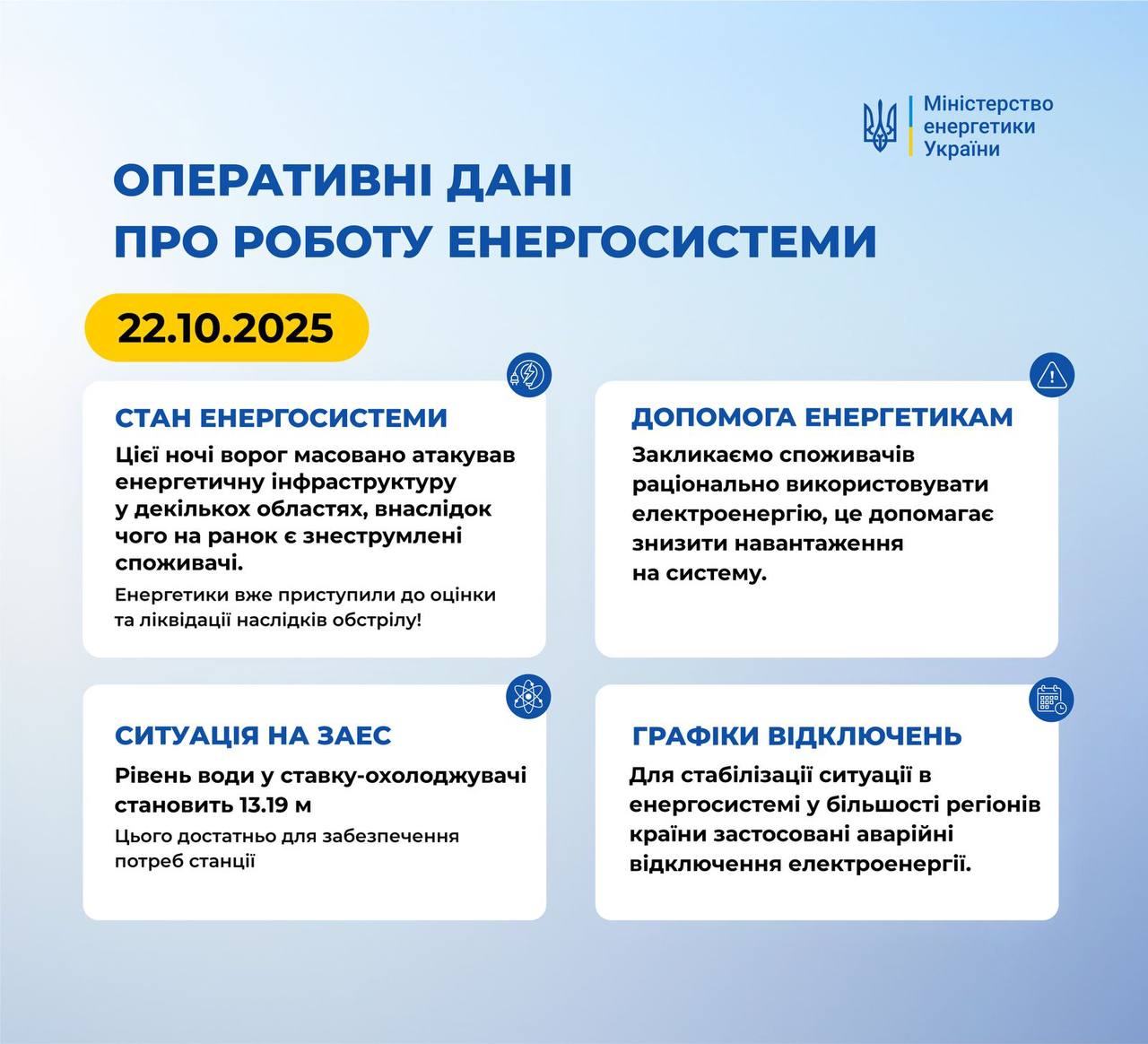 "Цієї ночі ворог масовано атакував енергетичну інфраструктуру у декількох областях, внаслідок чого на ранок є знеструмлені споживачі. Енергетики вже приступили до оцінки та ліквідації наслідків обстрілу", - йдетьяс у дописі.